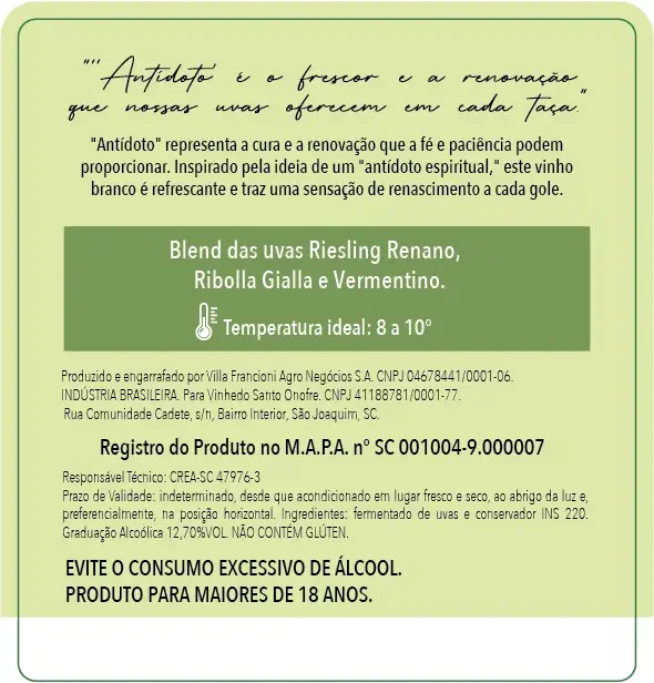 “Antídoto” é o elixir para a alma cansada, o renascimento em forma de vinho. Inspirado pela ideia de cura e renovação que a fé proporciona, este blend único de Riesling, Vermentino e Ribolla Gialla oferece uma sensação refrescante, com toques de frutas cítricas e notas florais. Assim como Santo Onofre encontrou paz e equilíbrio em sua devoção, “Antídoto” é a escolha perfeita para recarregar os sentidos e redescobrir o prazer em cada gole.